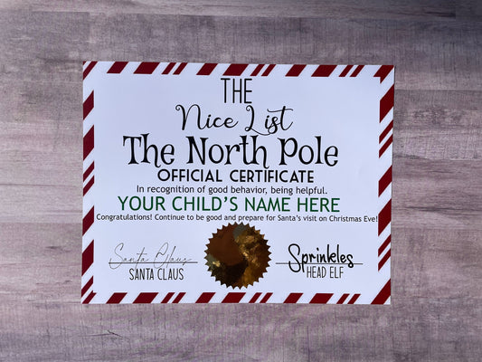 Custom Nice List Certificate from Santa Custom North Pole Certificate Custom Christmas Gift for Child Custom Gift for Boy or Girl Nice List