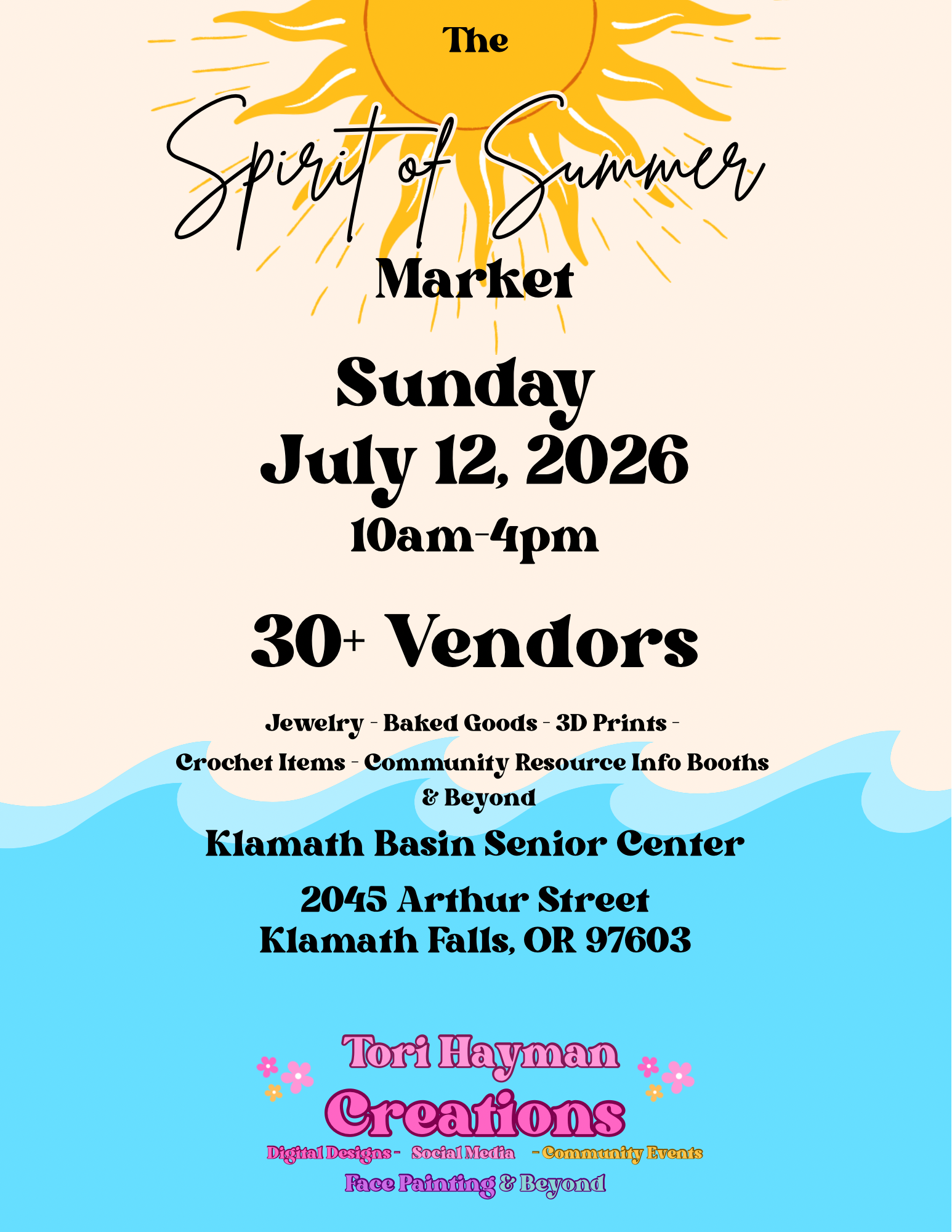 Join us Sunday, July 12, 2026, from 10am–4pm at the Klamath Basin Senior Center for a vibrant summer market featuring 30+ local vendors. From handmade goods to sweet treats, this is the perfect way to spend a summer Sunday with family and friends.